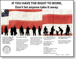 Then in small letters, it says you have a right to work free from discrimination for your national origin or citizenship status. AND, if you are not yet a citizen but can work here legally (ie – papers) you can’t be fired for being a non-citizen.